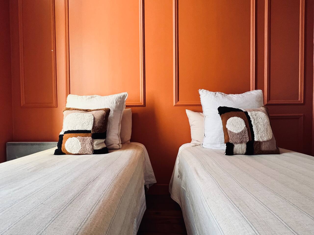 Access is through an entrance hallway that serves the sleeping area and opposite the living area, where there is a separate toilet. The living area: A spacious living room is composed of two facing sofas for beautiful moments of sharing and relaxation, a large smart TV and internet are available. The large windows and ceiling height provide comfort and peace to guests. Cozy, modern and bourgeois atmosphere. The dining room: In the extension of the living room, enjoy a space for your meals around a round table for the most beautiful moments of tasting in the comfort of vintage! The kitchen: Continuing from the dining room, a fully equipped kitchen awaits you to prepare your best dishes... or simply reheat your neighborhood groceries! Oven, microwave, induction hob, dishwasher, Nespresso (Vertuo Plus) and all the dishes you will need are available. The "little extra": At the end of the kitchen, a small balcony awaits you for your two-person breakfasts! The sleeping area: Back at the entrance, a small hallway serves the sleeping area isolated from the living area. Two bedrooms await you as well as the bathroom (large walk-in shower). Each bedroom offers its own style for your greatest pleasure! All bedding and pillows are provided by the Sofitel brand for a luxurious sleep, like at a hotel! The green bedroom, master bedroom, very elegant in a "luxurious British" style, offers a queen-size 160x200 bed facing an antique fireplace topped by a beautiful ornate mirror. The terracotta bedroom, warm and ethnic, offers two bed configurations to choose from: 2 single beds 90x200 or 1 king-size bed 180x200 (please let us know your preferred configuration at the time of booking, the bed will be prepared as a king-size if there is no special request). The bed configuration can be changed up to two days before arrival, beyond that we will not be able to change it. For reservations of two people or less, the second bedroom will be locked and the standard rate corresponds to a reservation of one bedroom. If you wish to have both bedrooms, an additional fee will be charged. Two sets of windows in each bedroom guarantee the silence of your nights, and the shutters allow for complete darkness.