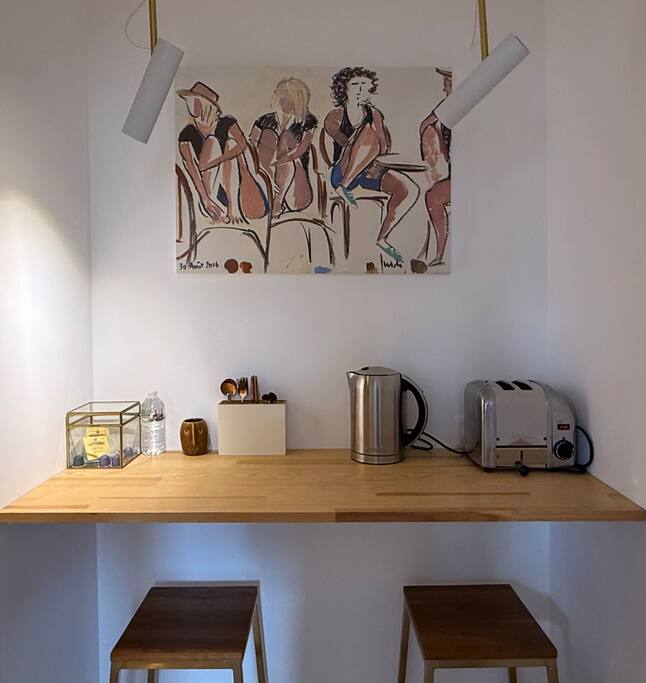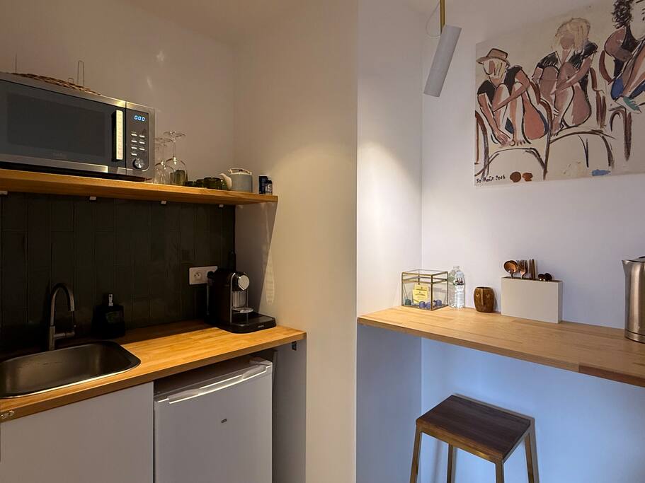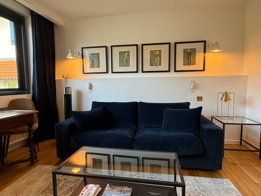 La suite dispose d’une entrée totalement indépendante, garantissant intimité et liberté de mouvement. L’accès se fait sans passage par les espaces communs, offrant une vraie sensation de logement privé, tout en bénéficiant de l’environnement paisible et soigné de la villa. Véritable appartement indépendant, la Suite Oasis se compose de plusieurs espaces distincts : • Une chambre élégante, décorée avec sobriété et matières chaleureuses • Une salle de bain privative, moderne et confortable • Un salon privé, idéal pour se détendre, lire ou travailler • Une kitchenette équipée, permettant une totale autonomie au quotidien Chaque espace a été pensé pour offrir fonctionnalité, calme et bien-être, avec une décoration soignée mêlant bois, teintes douces et œuvres artistiques. Les grandes ouvertures apportent une belle luminosité naturelle, créant une atmosphère apaisante, propice aux séjours prolongés. Style & Atmosphère La Suite Oasis s’inscrit dans un esprit chic discret et contemporain. • Une décoration inspirée du voyage, mêlant lignes sobres et touches artistiques • Une ambiance calme, feutrée et élégante, idéale en hiver • Un confort pensé pour se sentir “chez soi”, tout en profitant des standards hôteliers Confort & Services • Internet haut débit / fibre adapté au télétravail • Linge de maison et serviettes fournis • Ménage régulier possible sur demande • Chauffage et équipements adaptés aux séjours longue durée • Kitchenette équipée (réfrigérateur, micro-ondes, machine à café, bouilloire, vaisselle) Location hivernale Les Suites Oasis sont proposées individuellement en période hivernale, chacune fonctionnant comme un logement autonome. Ce format est particulièrement adapté : • aux voyageurs d’affaires, • aux profils en mobilité professionnelle, • aux séjours longue durée, • ou à toute personne recherchant un cadre calme, élégant et indépendant à Biarritz.